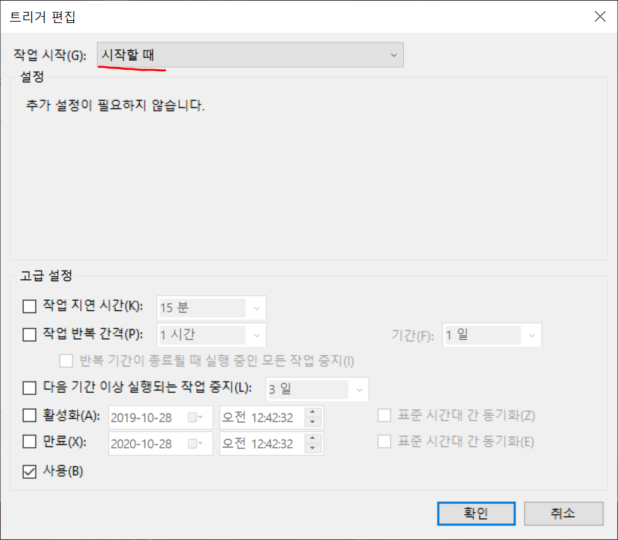 윈도우 키 > "작업 스케줄러" > 작업 만들기 > 일반/트리거/동작 3개의 탭에서 설정이 필요하다. 아래 사진참조